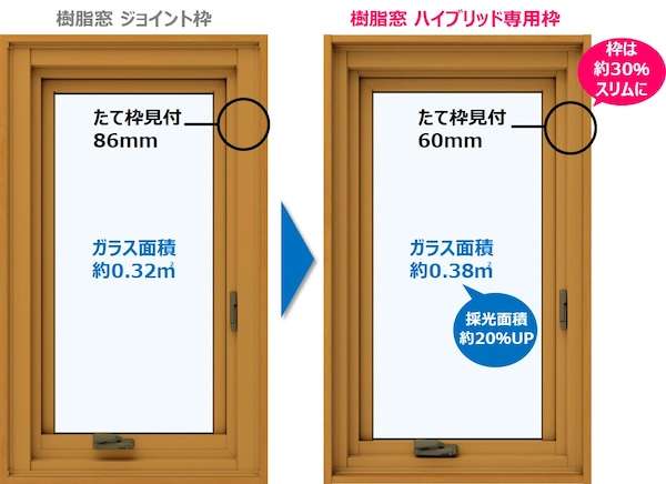 今回、引違い窓に加え、たてすべり出し窓・すべり出し窓・FIX窓のプロジェクト窓をハイブリッド専用枠に新設定。従来は既設枠と新設枠をつなぐ“ジョイント枠”を介して樹脂窓を納める必要があったが、専用枠によりこれが不要に。