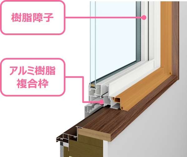障子のフレームは樹脂製のまま、枠をアルミ樹脂複合にすることで、断熱性と施工性を備えつつ、樹脂窓では叶えられなかったたて枠の見付を86mmから60mmへと約30%スリム化。ガラス面積を約20%拡大し、採光性とすっきりとした意匠性を両立させた。