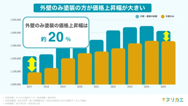 工事内容別に2017年を基準とした価格推移を比較すると、「外壁+屋根」の同時施工が約13.5%増だったのに対し、「外壁のみ」の施工は約19.6%(約22万円)増と、単一工事の上昇幅がより大きかった。資材費や人件費といった固定コストの上昇が背景にあり、その影響を受けやすい外壁単独工事では割高感が強まる傾向がみられた。