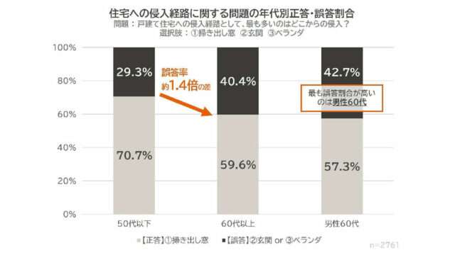 60代では、戸建て住宅への侵入でもっとも多い経路(正解は「掃き出し窓」)を問う設問で誤答した割合も60代以上では40.4%と、50代以下(29.3%)の1.4倍となった。警察庁の「犯罪統計資料」によると、2025年の重要窃盗犯の被害者のうち60歳以上が半数近くを占めており、被害者になりやすい世代ほど防犯知識が不足している傾向がみられる。