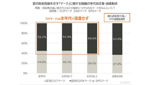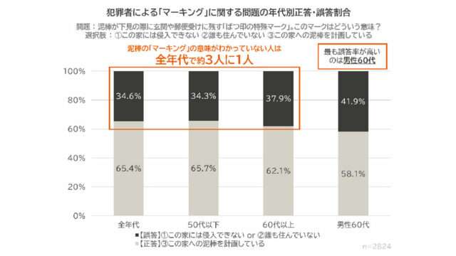 犯行前の下見で使われる「マーキング」は、広くメディアなどで取り上げられるようになったにもかかわらず、誤答率が全年代で3割を超えた。戸窓・ドアの防犯性能を示すCPマークの認知率も5割を下回っており、信頼性の高い指標ながら浸透していない現状が明らかになった。