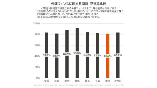 あわせて、東京都内在住の2779人に絞った分析も行った。25年の侵入盗が前年比22.5%増となった東京都だが、防犯に適した外構フェンスを問う設問で、正答率が他県に比べ相対的に低いという結果になった。設問では、見通しのよい縦格子を正答とし、その他の選択肢として高さ2m以上のブロック塀、背の高い生垣を提示。正答率は全国平均の83.4%に対し、東京都は81.0%だった。