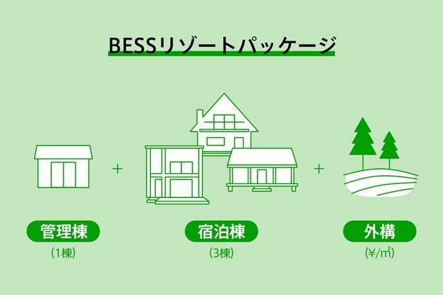 新たに販売する第1弾パッケージ「BESSリゾートパッケージ」は、管理棟1棟と宿泊棟3棟を組み合わせ、一棟貸しリゾート施設をスピーディーに開発できるパッケージ。一般的に2年以上かかるリゾート開発を、最短1年・1億円で竣工まで進めることが可能。開業後も、安定的に施設運営できる体制づくりをサポートする。パッケージには、企画設計・建築費用、管理棟・宿泊棟、外構費用(1000㎡分)が含まれている。