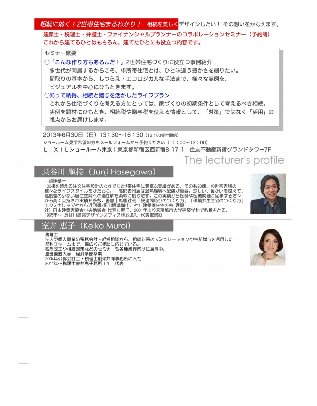 長谷川建築デザインオフィスは、「相続に効く!2世帯住宅まるわかりセミナー」を30日(日)東京都内で開催する。