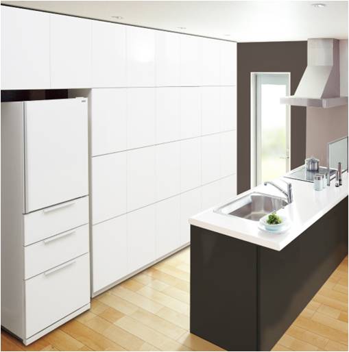新製品は、人気があり採用率の高い対面型キッチンに対応するウォールキャビネット。直線的でフラットなデザインとし、扉色にはどんな色にも合わせやすいグロスホワイトを採用した。