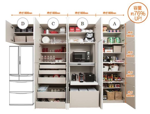 キャビネットは(A)大容量食品庫、(B)家電収納食器棚、(C)引出し付食器棚、(D)冷蔵庫上収納の4タイプで、収納するモノに応じて10パターンから選べる。