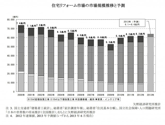13年の市場規模は6兆1000億~6兆4000億円と予測。今後、景気が上向き、省エネ性能など付加価値の高い建材や設備への交換需要が活発化し、消費増税前の前倒し需要が顕在化すれば、市場規模は6兆4000億円まで伸びると予測する。