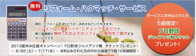 現在の住まい、要望内容、リフォームの優先順位を記入することで、おおよその部位別リフォーム費用を提示するサービス。この段階ではリフォーム会社に個人情報を開示しないため、リフォーム希望者にとっては強引な営業攻勢を受ける心配がなく、安心してサービスを利用することができる。