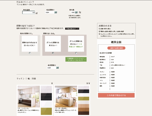新サービスは住宅設備や資材に加え壁や床、天井、配管などの下地も選べる。既存下地を利用することもできる。簡単に見積もりができるシミュレーションサイトも開設。間取りやリノベーションの範囲、使用する設備や仕上がりなど実際の工事に近づけて費用を見積もることができる。