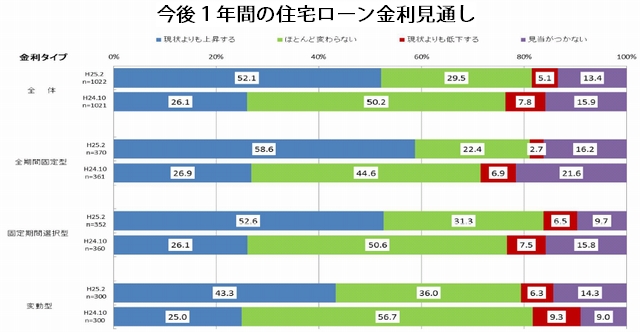 住宅金融支援機構は7月4日、今後5年以内に住宅取得予定がある民間住宅ローン利用予定者を対象に今年2月おこなったアンケート調査の結果を発表した。それによると、今後1年間の住宅ローン金利の見通しについて、今よりも上昇するとした人が半数を超えた。前回2012年10月の調査時から大幅に増えた。全期間固定型の利用希望者は前回から0.8ポイントと微増し36.2%になった。変動型は29.4%と変わらなかったが、固定期間選択型が35.3%から34.4%に減った。