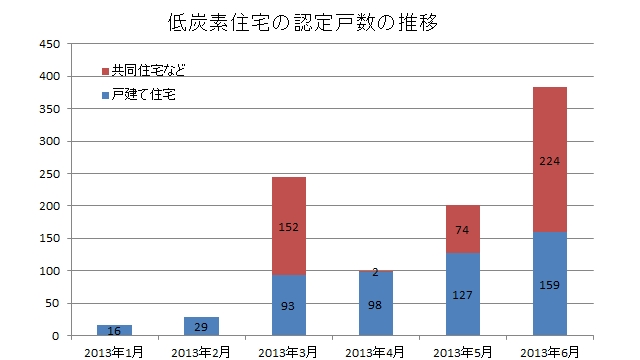 国土交通省が7月12日発表した低炭素建築物の認定戸数の速報値は、6月単月で383戸だった。2013年1月から6月までの累計は974戸。