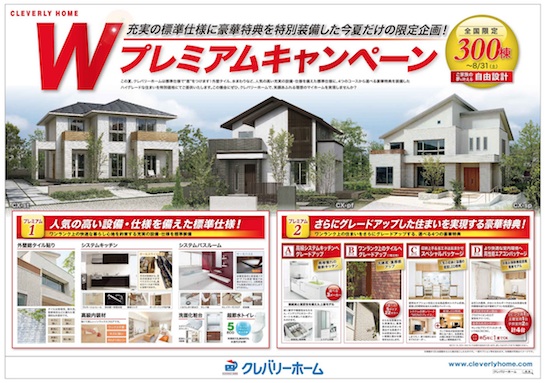 住宅FCのクレバリーホーム(本部:新昭和、千葉県君津市)は7月13日〜8月31日、増税前の受注促進をめざして「Wプレミアムキャンペーン」を開催する。