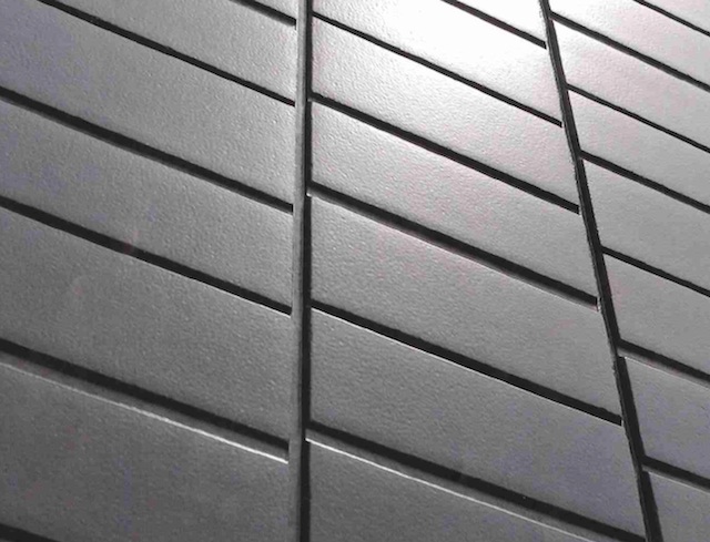 多様化する壁面デザインのニーズに応えるため、セメント板にグリッド状の溝を付けたもの。新シリーズのデザイン第1弾は、ランダムに配置したタイル柄の「ランディル」で、タイル張りよりも安価で、剥落などの心配が要らないというメリットがある。