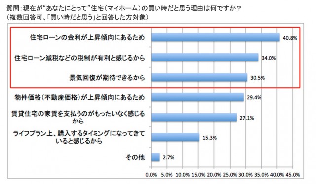 マイホーム未購入者に、現在、住宅が「自分にとって」買い時だと思うかとの問いには、35.7%が「買い時だと思う」と回答し3年ぶりに3割を越えた。理由のトップ3は、「住宅ローンの金利が上昇傾向にあるため」40.8%、「住宅ローン減税などの税制が有利と感じるから」34%、「景気回復が期待できるから」30.5%で、税制やアベノミクスへの期待感が感じられる結果となったとした。