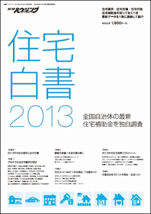 住宅市場を取り巻く業界・生活者・行政の現状を1冊でまるわかり解説することをコンセプトとした、新建ハウジングの新しいムック「住宅白書2013」を発刊しました。住宅市場を最新の統計・調査データや取材情報をもとに分析し、表やグラフでわかりやすく解説しました。事業計画や企画の立案、施主への提案資料、社員教育ツールとして役立てていただきたい1冊です。