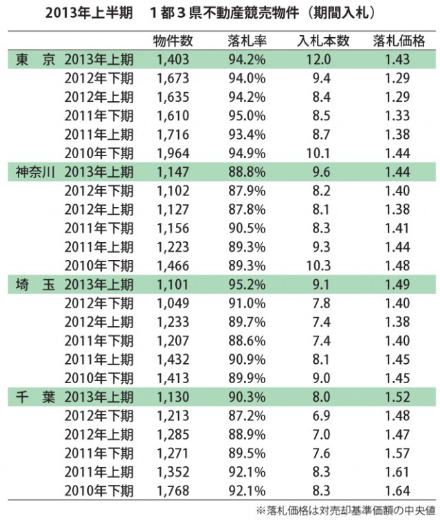 関東の不動産競売情報を扱うエステートタイムズ(東京都豊島区)は7月30日、2013年上期の不動産競売統計(期間入札)を発表した。2011年から12年にかけて落札価格の下落が続いたが、今年上期は各都県で上昇した。