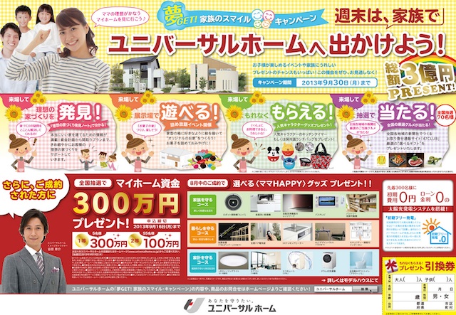 住宅FCを展開するユニバーサルホーム(東京都中央区)は8月3日〜9月30日まで、総額3億円相当のプレゼント企画を用意した「夢GET!家族のスマイル」キャンペーンを全国一斉開催する。