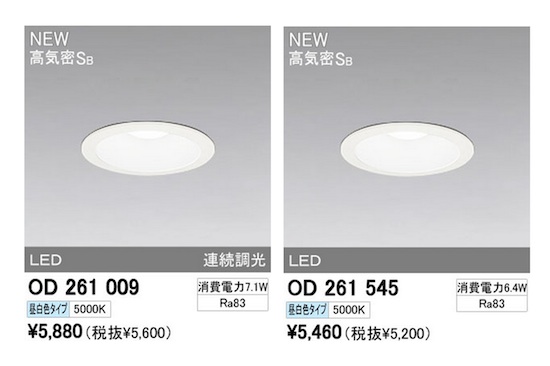 いずれも白熱灯60Wクラス、埋込穴径Φ100で、エネルギー消費効率は87.5lm/W。価格は連続調光タイプが税別5600円、軒下用5200円と、従来品よりも2600〜1600円低価格を実現した。