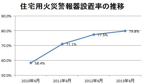 消防庁が8月13日発表した2013年6月1日時点の住宅用火災警報器の設置率(推計)は、79.8%で前回(12年6月1日)よりも2.3ポイント上昇していた。