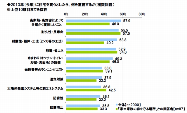 セルコホーム(宮城県仙台市)が7月5日から12日まで30~59歳の既婚男女2000人を対象に実施した調査によると、住宅を買う時に重視する項目の1位は「高断熱・高気密によって冬暖かく夏涼しいこと」(57.9%)だった。2位は「耐久性・長寿命」(55.5%)、3位は「耐震性・躯体・工法)」(53.8%)、4位は「節電・省エネ」(52.9%)が続いた。