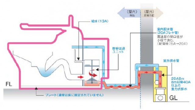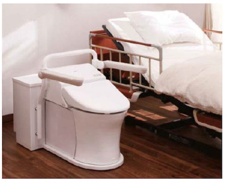 圧送便器は、住宅や介護施設の居室のベッドサイドに設置する水洗便器。洗浄操作を行うと汚物が圧送排水ユニットに送り込まれて粉砕され、さらに圧送装置によって小口径の排水ホースを通り配水管に排水される。設置後も便器の位置を変更できるのが特徴。