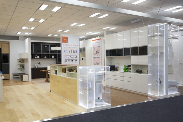 収納コーナーには、相談が多いキッチン、ダイニング回りの収納を中心に具体的な暮らしのイメージに基づいた空間提案を展示。収納するものと奥行きの関係を視覚的に確認できる展示や、収納の考え方をわかりやすく見せるパネルなどで、製品の説明にとどまらず、どのように収納するかまでイメージできるような工夫を施した。