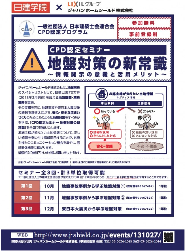 ジャパンホームシールド(東京都墨田区)は10〜12月、日建学院(東京都豊島区)と共同で工務店や住宅メーカーを対象に地盤対策に関する全3回のCPD認定セミナー「地盤対策の新常識 ~情報開示の意義と活用メリット~」を全国59会場で開催する。