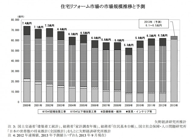 13年の市場規模は6兆1000億~6兆5000億円と予測。最近の新設住宅着工が好調に推移していることから消費増税前の前倒し需要が顕在化しているとし、下期〜14年3月にかけてはリフォーム市場も拡大するとした。ただし、長期にわたりリフォーム市場の好調が続いたケースはほとんどないため、リフォームしたいマインドが息切れする可能性についても指摘した。
