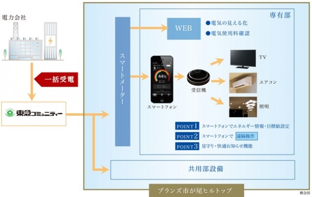 この節電サービスはグループ会社の東急コミュニティー(東京都世田谷区)が提供するもので、東急コミュニティーが電力会社より電力を一括受電し、共用部と専有部に電力供給するというもの。MEMS(マンションエネルギーマネジメントシステム)による遠隔操作や使用量の「見える化」、情報の提供により、居住者の節電行動を促す。