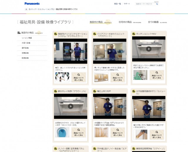 パナソニック(大阪府門真市)エコソリューションズ社は10月7日、住宅向け、介護施設向けの福祉用具・設備の特長や使用イメージを映像で紹介する「福祉用具・設備 映像ライブラリ」を公開した。
