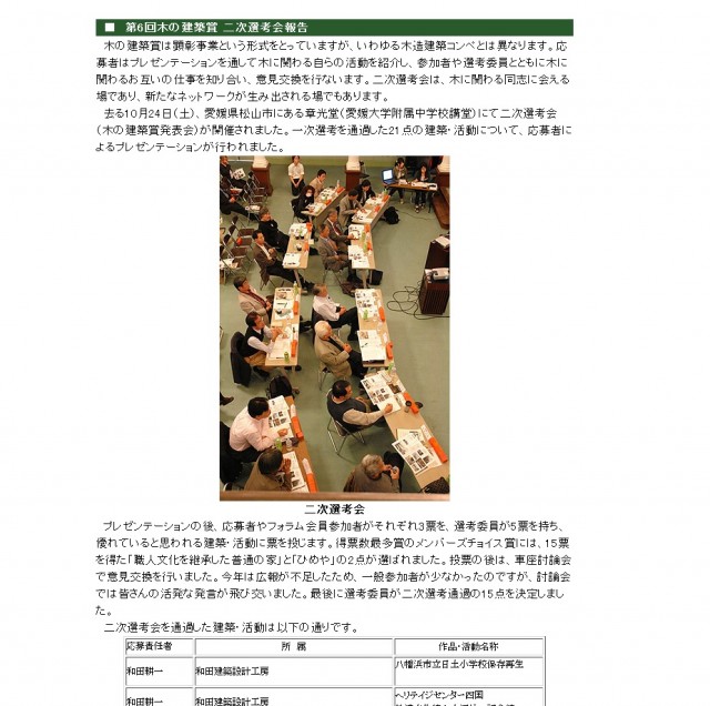 NPO法人木の建築フォラムは、木造建築が目指すべき姿を示す取り組みを表彰する「第9回木の建築賞」の第二次選考会を10月19日(土)京都造形芸術大学(千秋堂)にて開催する。