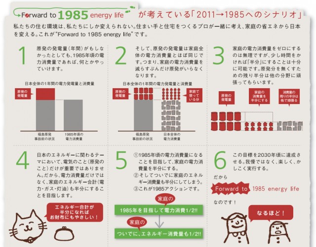 「Forward to 1985 energy life」は東日本大震災後、野池代表の「能動的に自宅のエネルギー消費量と電力消費量を半分=1985年頃の状況に減らすことで、産業部門のエネルギー消費量や電力消費量は現状のままで原発に頼らない社会をつくり、エネルギー安全保障上のリスクを減らし、地球温暖化対策に大きく寄与しよう」という呼びかけに賛同したメンバーによって運営されてきた。
