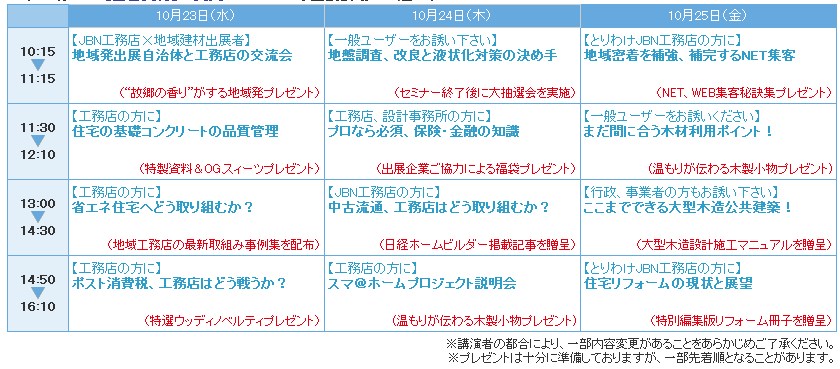 セミナーゾーンでは、会期中毎日1日4回、新建ハウジングを含むメディア協力会員をはじめ様々な協力会員との連携セミナーが開催される。テーマに応じたプレゼントも用意する。参加は無料。内容は以下のとおり。 参加は直接JBNブース・セミナーゾーンへ。事前申し込み不要。