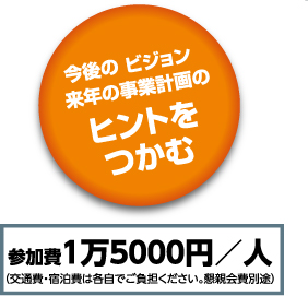 ![]() 今後のビジョンの来年の事業計画のヒントをつかむ 参加費 1万5000円/人(交通費・宿泊費は各自でご負担ください。懇親会費別途) |