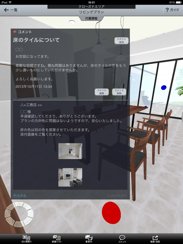 アプリは、住宅デザインソフト「3Dマイホームデザイナー」で作成したデータをスマホやタブレットで閲覧したり、外観・内観の確認、ウォークスルーなどができるもの。最新版では、3Dモデルの任意の場所を指定してコメントを書き込む機能を追加。コメントに対する返信や、コメントを選択してフェイスブックに投稿したり、メールを送信することも可能になった。
