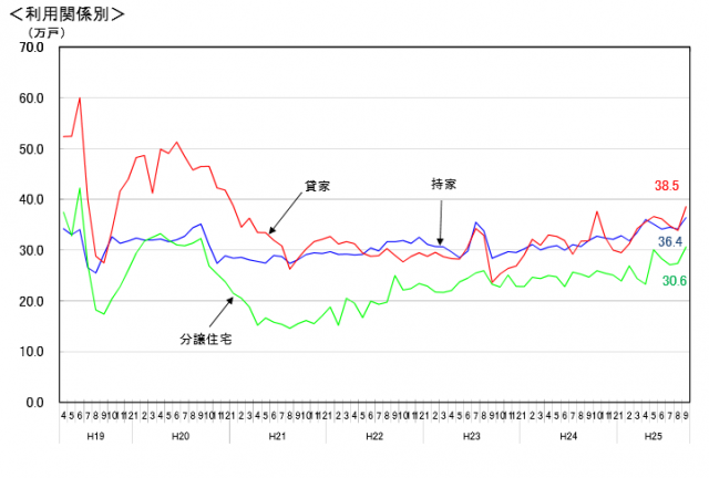 持家は3万2128戸で14.2%増加。貸家は3万1982戸で21.5%増。分譲住宅は一戸建てが1万1396戸で12.4%増加、。マンションが1万2497戸で35.6%増加となった。