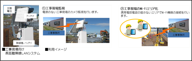 2.4Gまたは4.9Gの長距離無線LAN回線を利用することで、通信回線のない工事現場でも監視カメラの映像を伝送して工事の進捗や安全管理をリアルタイムで確認できるシステム。