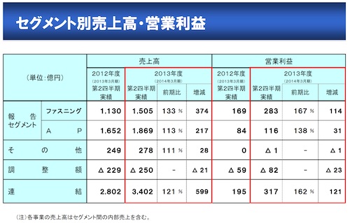 建材などのAP事業の売上高は前年同期比13.2%増の1869億円、営業利益は同37.5%増の116億円の増収増益を達成した。消費税増税前の駆け込み需要や金利の先高感などにより、国内の新設住宅着工が好調に推移したことと、製造コストの削減の影響が大きいとする。