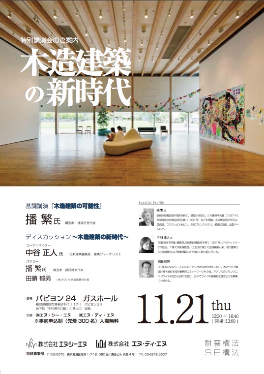 「SE構法」のエヌ・シー・エヌ(東京都港区)は11月21日、パピヨン24(福岡県福岡市)において大規模木造建築物のこれからを考える講演会「木造建築の新時代」を開催する。