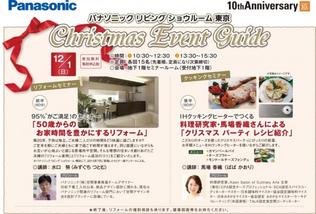 12月1日にはクリスマスイベントとして、実例を使ったリフォームセミナー「50歳からのおうち時間を豊かにするリフォーム」と、料理研究家・馬場香織氏によるIHクッキングセミナー「クリスマスパーティ レシピ紹介」を実施する。