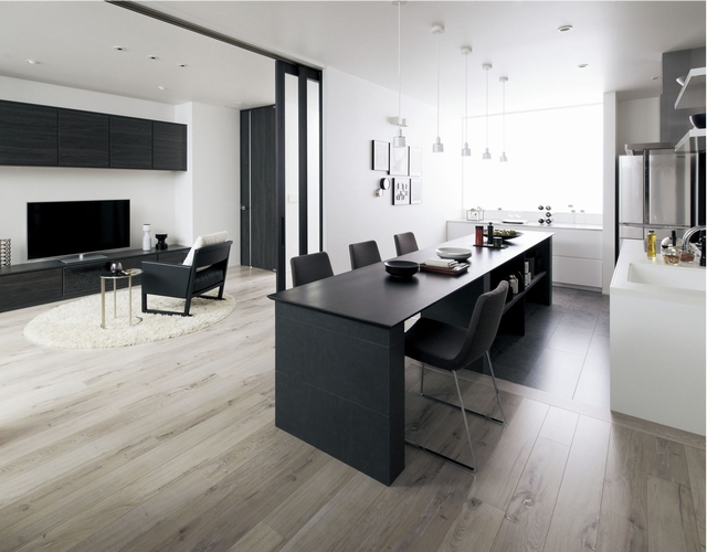 新シリーズは、「木目」「木肌」「照り」「艶」「色彩」の5つの視点で無垢材の素材感を再現した。特に床材に用いる木質材料は、独自の「熱着色」技術で木質そのものの色を変化させた。