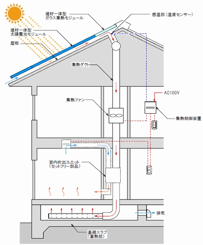 認定された太陽熱利用システム(カスケード方式)は、太陽電池モジュールやガラス集熱モジュールと屋根面の間に外気を取り込み、温められた空気を床下に搬送する空気集熱型のシステム。集熱された空気は、集熱ダクトを通して集熱ファンによって床下に送られ、床を介して室内を暖房するとともに蓄熱部に蓄熱する。集熱された空気は、室内吹き出しユニットで居室内の空気と熱交換を行い、室内を暖めることもできる。