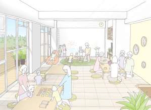 共用部の施設として、リビングには誰もが自由に書き込める「落書きボード」を、各階にユニットバスやミニキッチンなどを設置する。屋上にはウッドデッキや家庭菜園のほか素足で遊べるエリアを設ける。