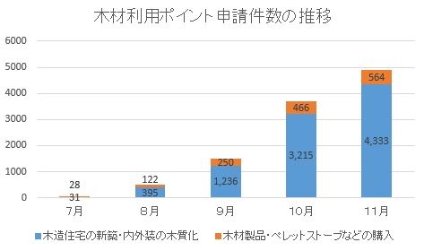 木材利用ポイント事務局が12月5日発表した、11月末時点の木材利用ポイントの申請状況の集計結果によると、11月単月の申請件数は、木造住宅の新築と内装・外装木質化を実施した人からの申請が4333件、木材製品とストーブの購入者からの申請が564件だった。いずれも10月より件数は伸びているが、伸び率は鈍化した。