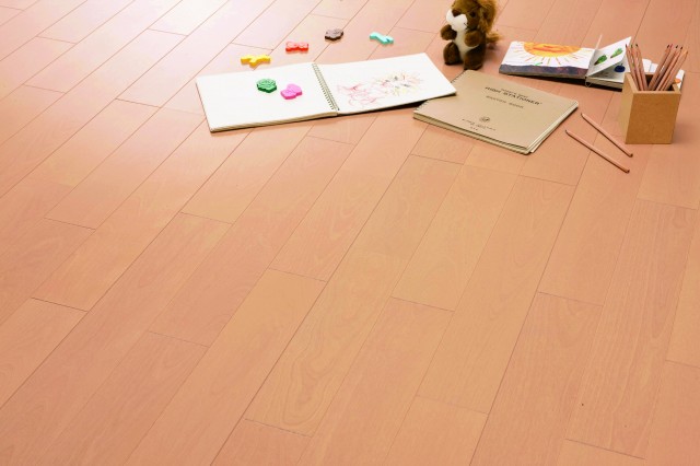 基材には国産針葉樹合板を採用。キズ、汚れ、車椅子に強い機能性を備えた。 表面材はサクラ突き板とオーク突き板の2種類で、計6色。税別3万円/束(3.31m2)。