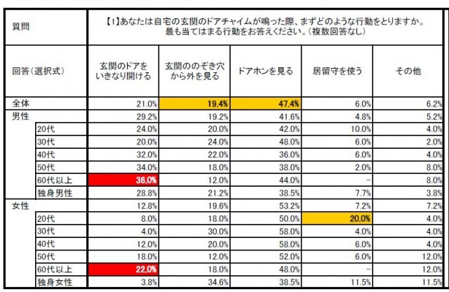 一方、20〜30代の女性および独身女性は防犯意識が高く、チャイムが鳴ったときの心境として「誰が来たか不安」(56~58%)と回答。30代女性の88%が訪問者をまず確認すると答えた。