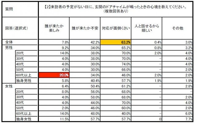 玄関のチャイムが鳴った際の行動を聞くと、60代男性の3人に1人以上(36%)が訪問者を確認せず「玄関のドアをいきなり開ける」と回答。来訪者の予定がないのにチャイムが鳴ったときの心境については、「誰が来たか楽しみ」と答える割合が60代男性がもっとも高く(20%)、期待感もあって確認なしに玄関を開けていることが推測できるとする。