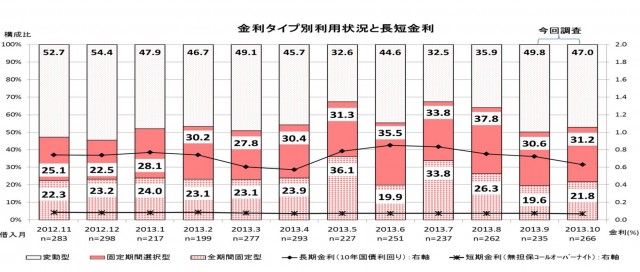 「変動型」の利用割合は9月が49.8%、10月が47%と7・8月より増加し2013年3月と同水準となった。「固定期間選択型」「全期間固定型」の利用割合は7・8月より減少した。詳細はコチラ。