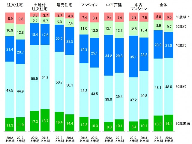 それによると、50歳以上の構成比が前年度より1.4ポイント上昇し16.2%に。土地付き注文住宅は30代が54.3%と過半数を占めた。家族数には大きな変化が見られなかったが、中古戸建て、中古マンションでは2人以下の構成比が上昇した。