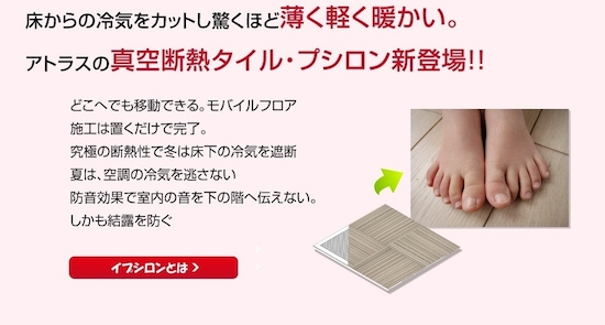 アトラス(千葉県成田市)はこのほど、既存の床、壁、天井などの上から張るだけで断熱性能を向上できる真空断熱タイル「イプシロン」のネット販売を始めた。 厚さ20ミリでグラスウール500ミリと同等の性能を発揮、年間冷暖房費を最大で80%削減できるとする。床は置き敷き、壁などは専用両面テープで固定するだけの簡単工法。